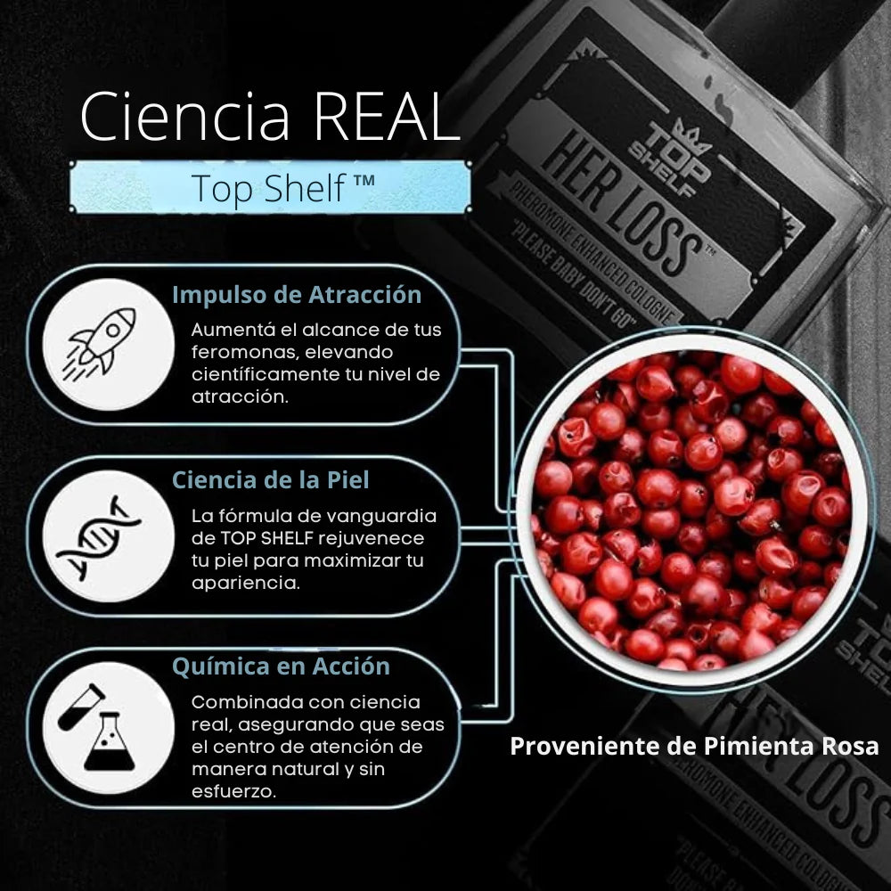 Her Loss™ combina un aroma masculino intenso con feromonas para elevar tu confianza, llamar la atención y generar más miradas y cumplidos en tu día a día.